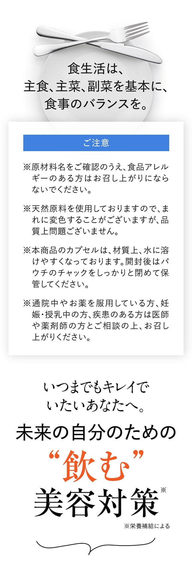 | ご利用上の注意 | ヘリオスキン ◇ 原材料名(ここをクリックし)をご確認のうえ、食物アレルギーのある方はお召し上がりにならないでください。 ◇天然原料を使用しておりますので、まれに変色することがございますが、品質上問題ありません。 ◇本品は、多量摂取により疾病が治癒したり、より健康が増進するものではありません。一日の摂取目安量を守ってください。 ◇まれに体調や体質により合わない場合がありますので、その場合はご使用を中止してください。 ◇通院中やお薬を服用している方、妊娠・授乳中の方、疾患のある方は医師や薬剤師の方とご相談の上、お召し上がりください。 ◇乳幼児の手の届かない場所に保存してください。 ◇カプセルは材質上、水に溶けやすくなっておりますのでご注意ください。 ◇食生活は、主食、主菜、副菜を基本に、食事のバランスを。 ※本品は、特定保健用食品と異なり、消費者庁長官による個別審査を受けたものではありません。 |