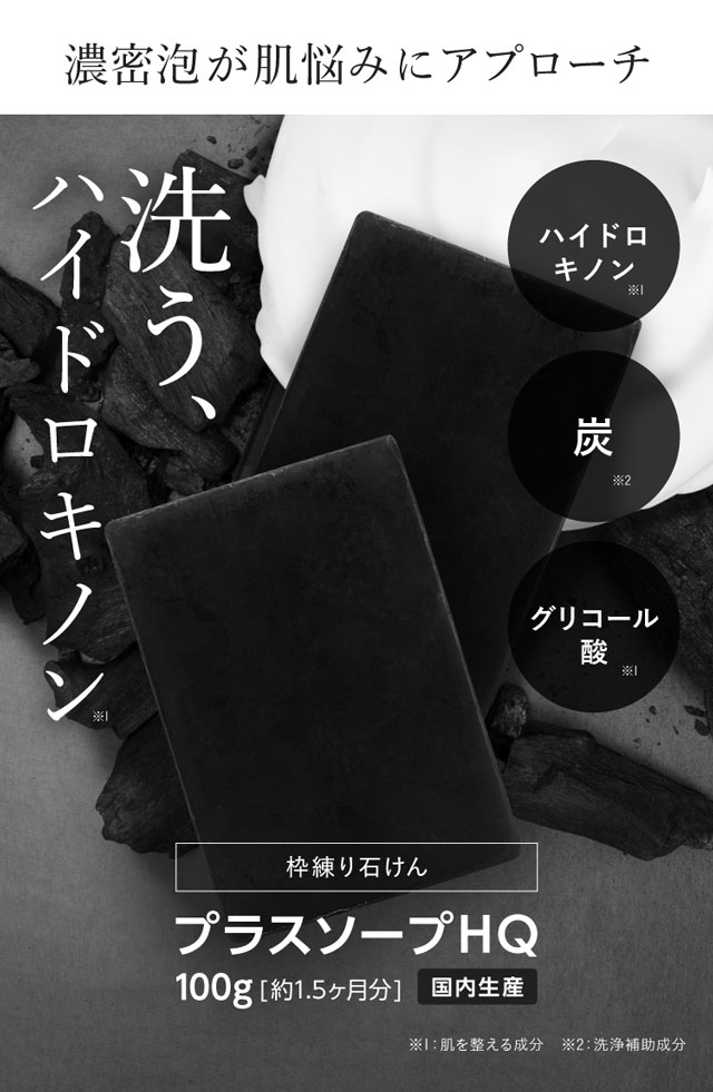 こだわりの成分【ハイドロキノン(1%以下)(※1)】、【炭(※2)】、【グリコール酸(※1)】がクリアな肌に導く。 今話題の黒石鹸、洗うハイドロキノン!