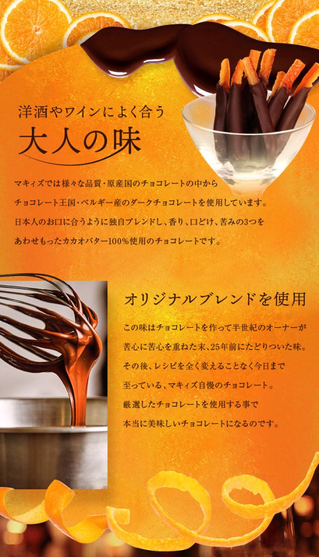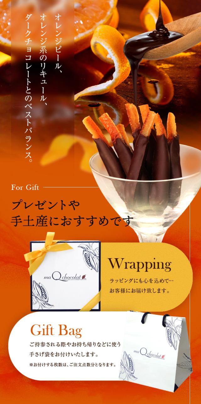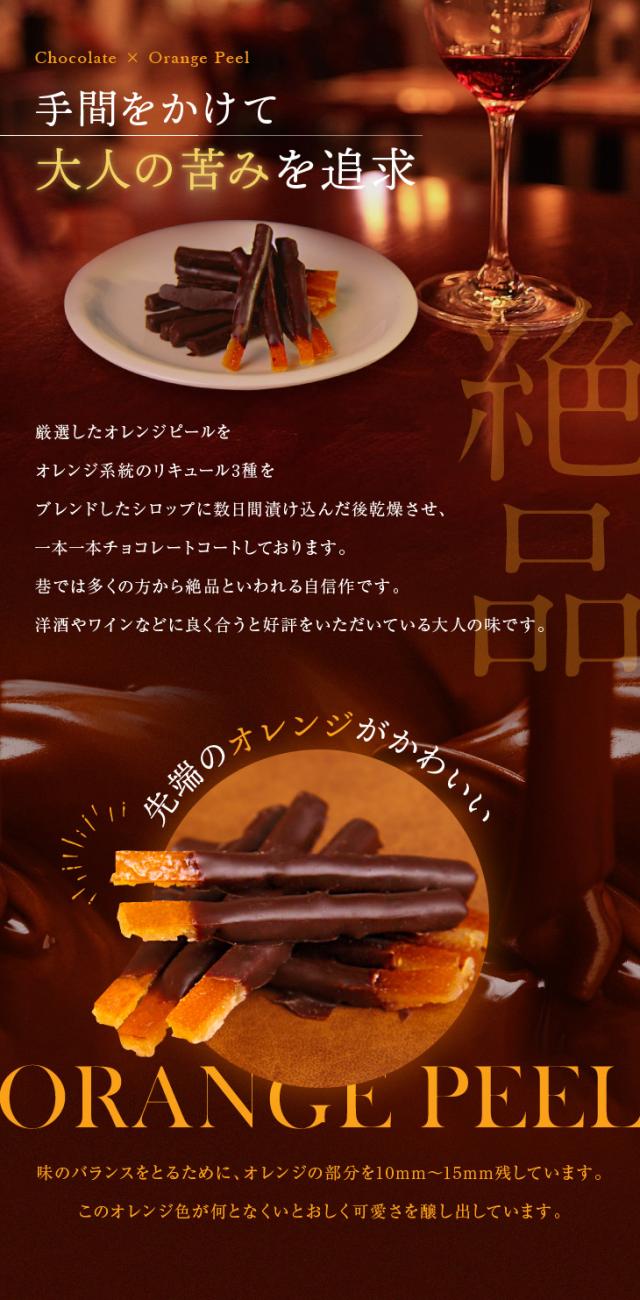 厳選したオレンジピールを3種の洋酒をブレンドしたシロップに数日間漬け込んで、ダークチョコレートを一本一本手作業でコート