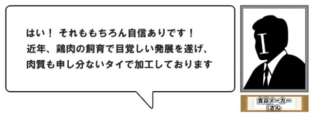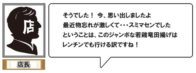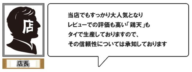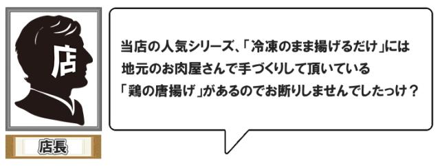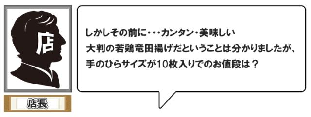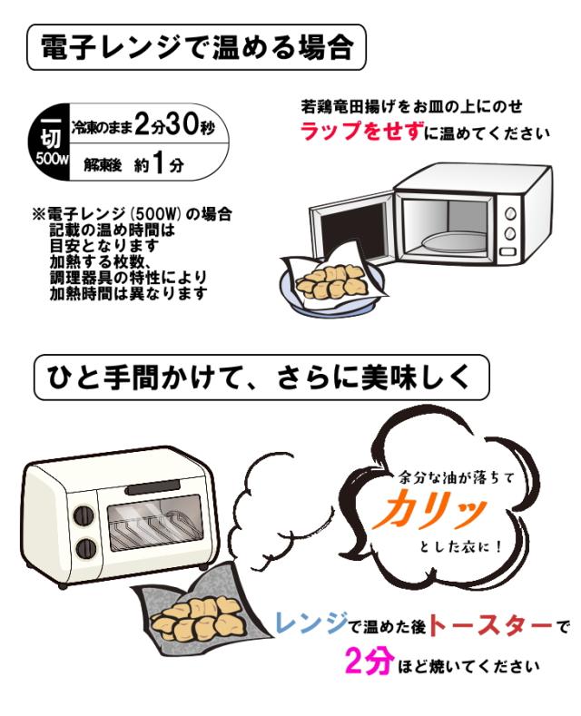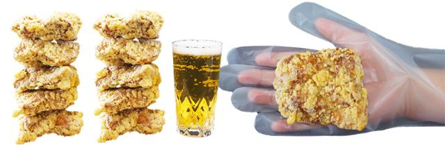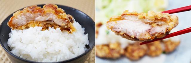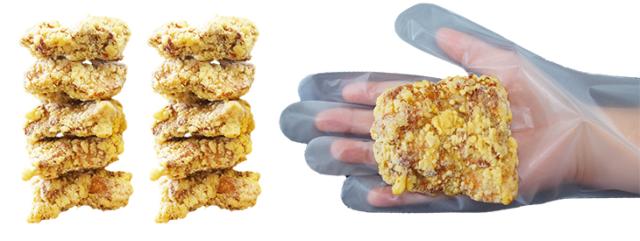 ・原材料:鶏もも肉、衣(ばれいしょでん粉(遺伝子組換え不分別))、しょう油、卵白液、しょうがペースト、にんにくペースト、みりん、食塩、脱脂粉乳、揚げ油(大豆油)/調味料(アミノ酸等)、重曹、(一部に卵・乳成分・小麦・大豆・鶏肉を含む)