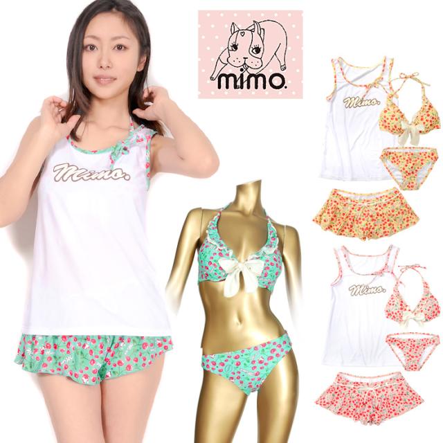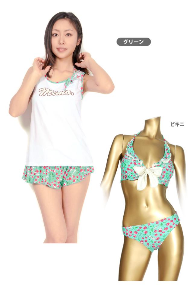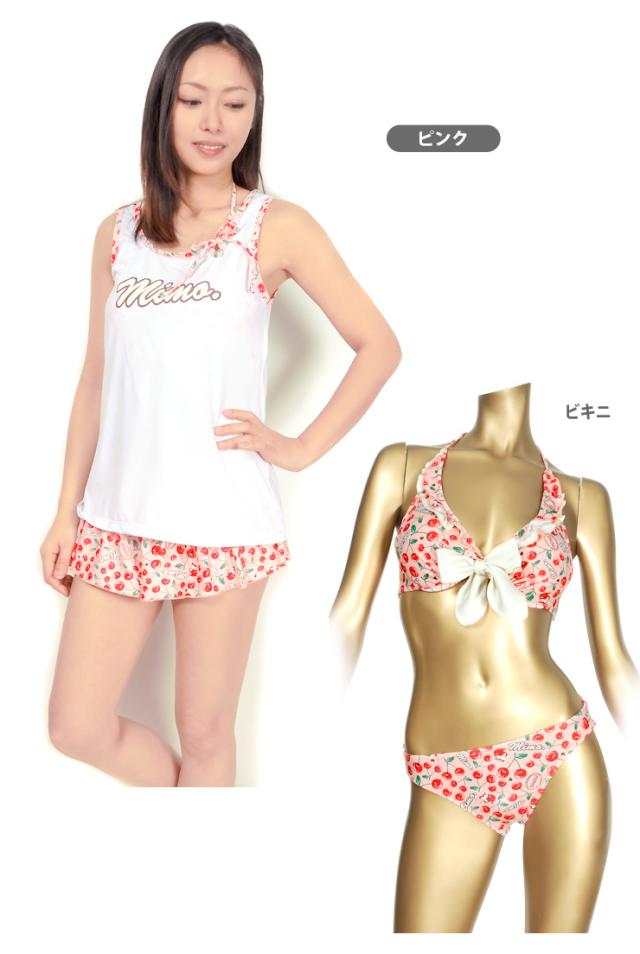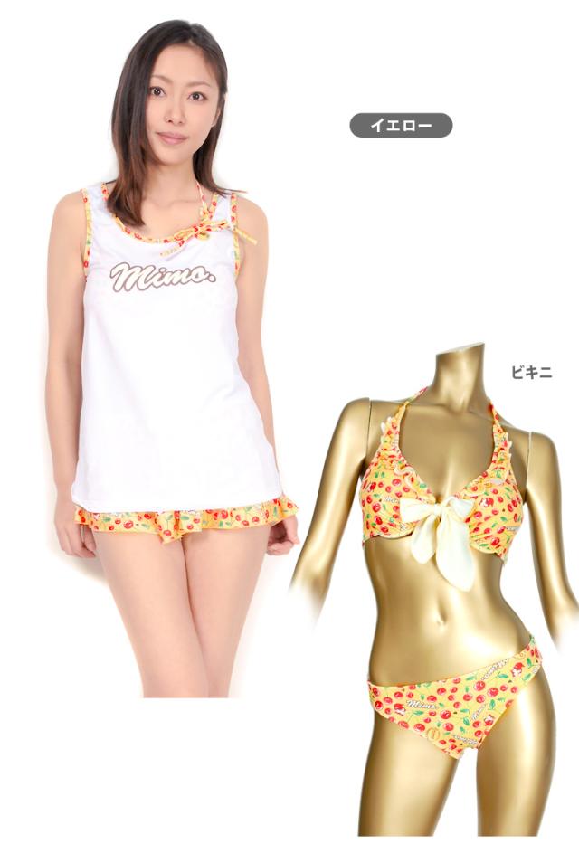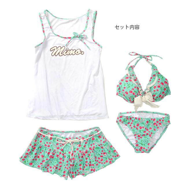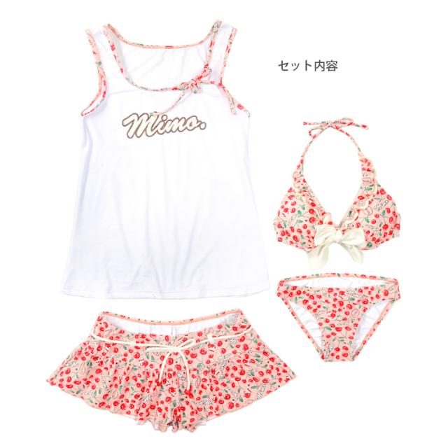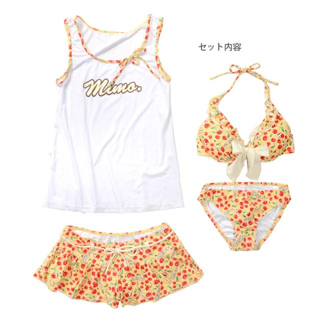 MIMO(ミモ)のセットアップ水着。タンクトップ、ショートパンツ、ビキニ上下の4点セットです。チェリー柄が全体に散りばめられた柄が可愛い感じ。普段着みたいに着られるから、あまり露出をしたくないという方にもオススメ!ビキニは取り外しのできる盛りパッド入りです。ビキニカップはワイヤー入りで、ショートパンツウエストはゴムが入っています。