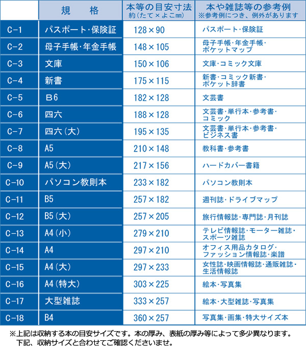 | 収納可能な本の目安寸法 ※サイズをお調べの上、お求めください。 |