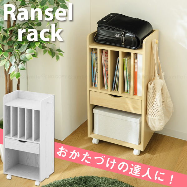 置き場所をとるお子様のランドセルをスッキリ収納できるキャスター付きおかたづけラックです。