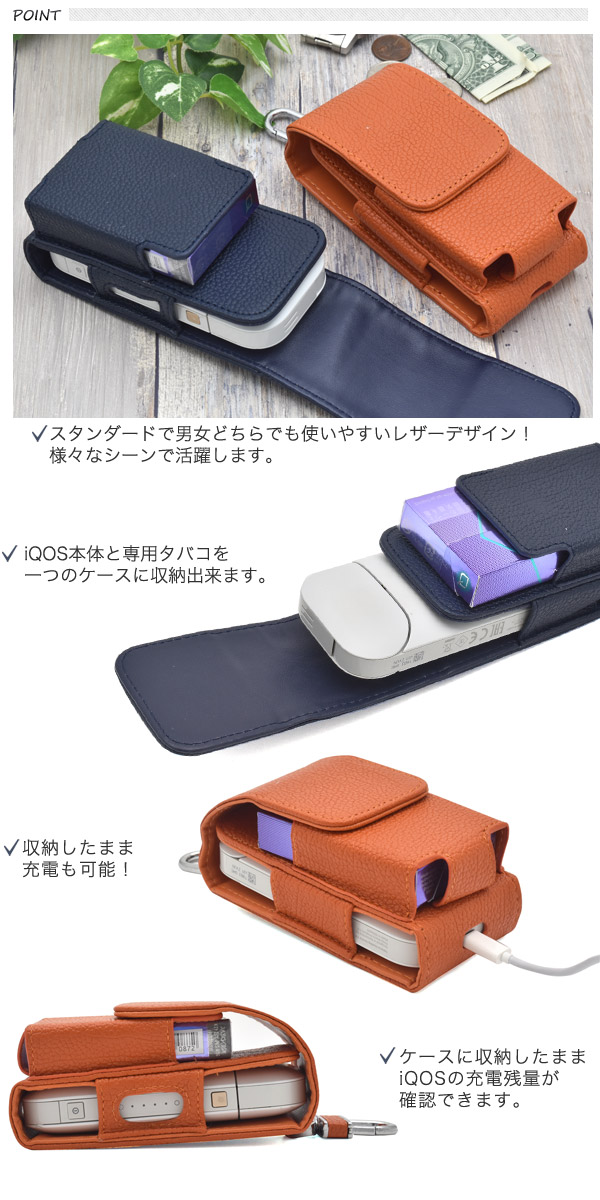 スタンダードで男女どちらでも使いやすいレザーデザイン!様々なシーンで活躍します。■iQOS本体と専用タバコを一つのケースに収納!メインポケットにアイコス本体を収納でき、全面ポケットには専用タバコが入ります。■収納したまま充電!iQOSの充電残量も確認可能!ケースに入れたまま充電することができます。またiQOSの充電残量も確認可能です。■開閉ラクラクのマグネットフラップ式!マグネットフラップ式なので、スムーズに開閉が可能です。■便利なカラビナ付き!360度回転するカラビナ付き。バッグやベルトに装着するのに最適です。