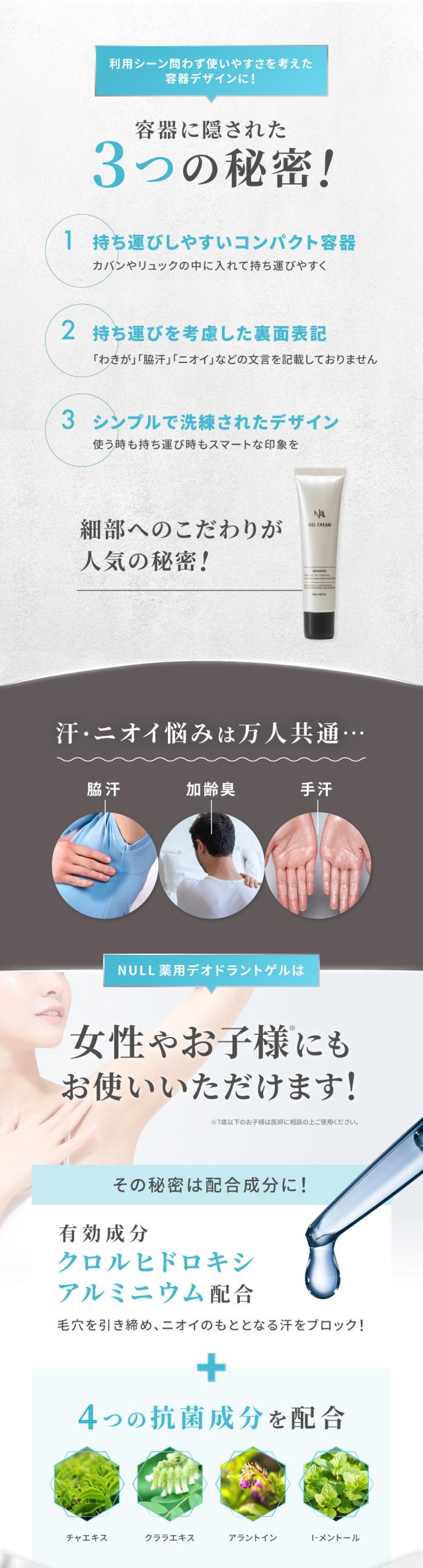 【 男女兼用でお子様にも! 】 デオドラント 制汗剤 メンズ 女性 レディース ワキガ わきが 脇汗 足汗 足の臭い 汗じみ 手汗 対策 【4大臭素96%カット!】 NULL デオドラントゲル わきが ワキガ 子供 加齢臭 体臭 臭い わきが対策 足の匂い デオドラントクリーム