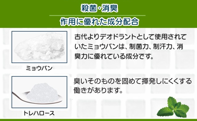 ミョウバン、トレハロース、ペパーミント油などの消臭に優れた成分を独自の配合により抗菌・脱臭・防臭。