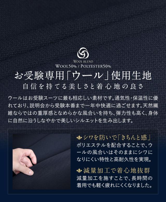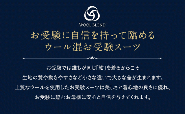 ・ウールはお受験スーツに最も相応しい素材です。通気性・保温性に優れており、説明会から受験本番まで一年中快適に過ごせます。天然繊維ならではの重厚感となめらかな風合いを持ち、弾力性も高く、身体に自然に沿うしなやかで美しいシルエットを生み出します。