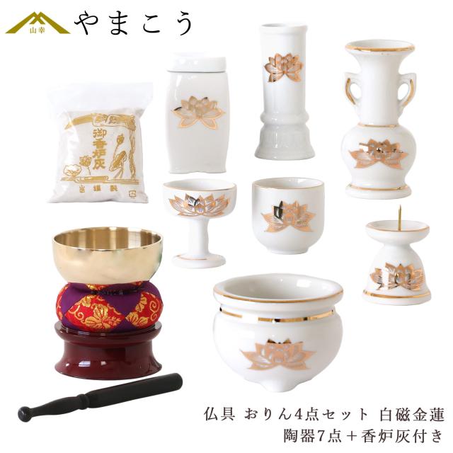 仏具 セット ミニ おりん 4点+陶器7点(白 金蓮 ホワイト キンハス)+香炉灰 仏具セット おしゃれ モダン 線香立て マッチ消 国産 日本製 仏壇セット モダン仏具 モダン仏壇 お盆 お彼岸 お墓参り お供え 供養 法事 法要