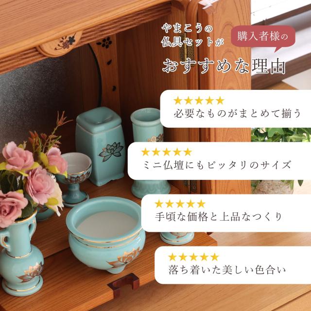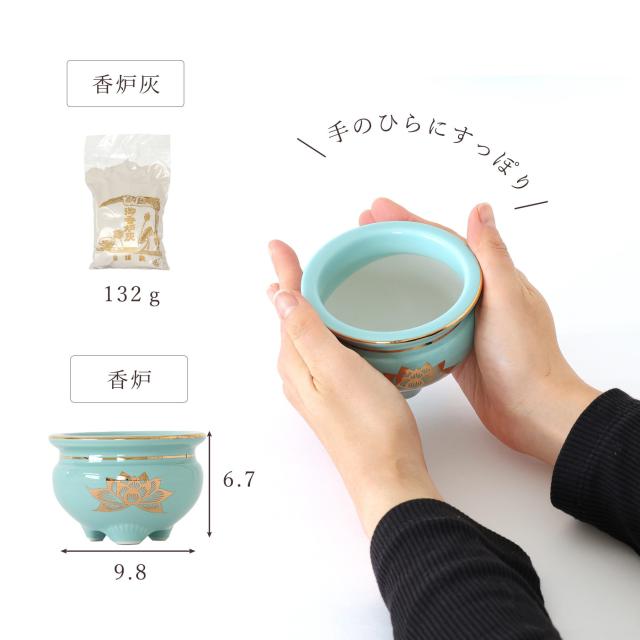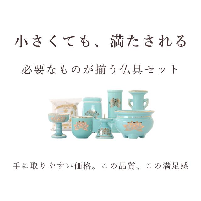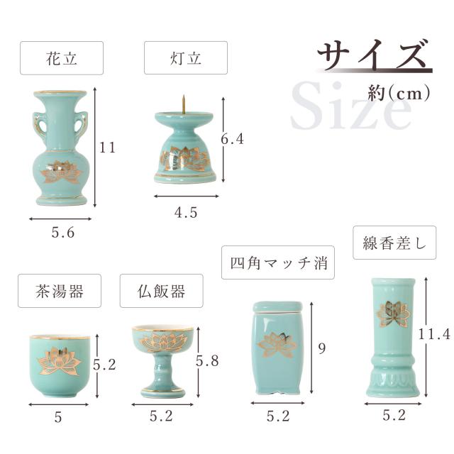 仏具 セット 陶器7点 (青磁 金蓮 青地 キンハス ブルー) + 香炉灰 仏具セット おしゃれ モダン 線香立て マッチ消 国産 日本製 仏壇セット モダン仏具 モダン仏壇 お盆 お彼岸 お墓参り お供え 供養 法事 法要