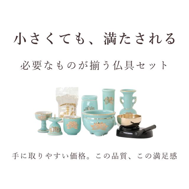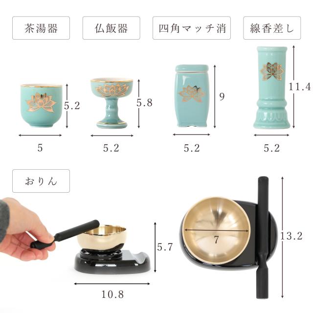 仏具 セット ミニ おりん 3点 + 陶器7点 (青磁 金蓮 青地 キンハス ブルー) + 香炉灰 仏具セット おしゃれ モダン 線香立て マッチ消 国産 日本製 仏壇セット モダン仏具 モダン仏壇 お盆 お彼岸 お墓参り お供え 供養 法事 法要