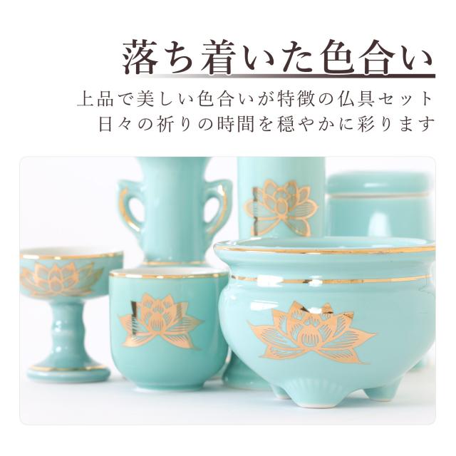 爽やかで落ち着いた色合いの薄ブルーに、金蓮の柄が美しい国産陶器の仏具セット。
