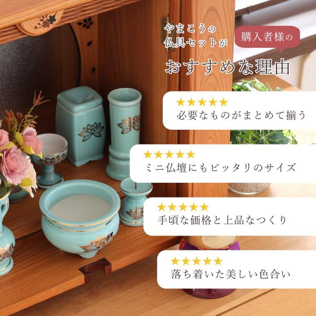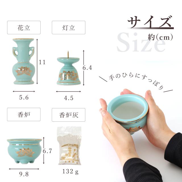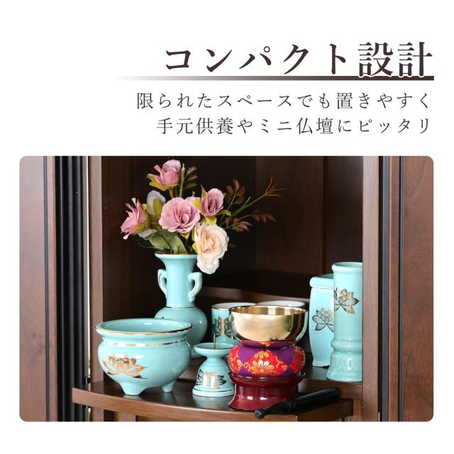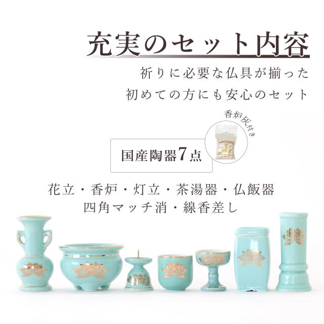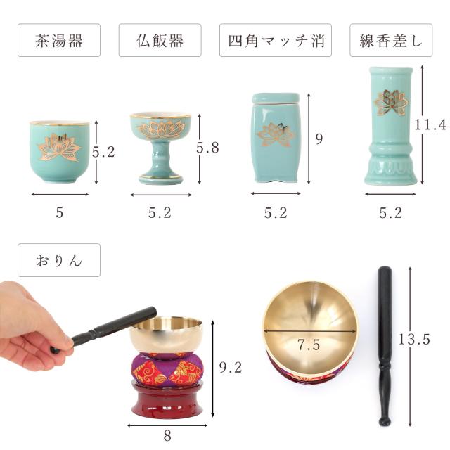 仏具 セット ミニ おりん 4点 + 陶器7点 (青磁 金蓮 青地 キンハス ブルー) + 香炉灰 仏具セット おしゃれ モダン 線香立て マッチ消 国産 日本製 仏壇セット モダン仏具 モダン仏壇 お盆 お彼岸 お墓参り お供え 供養 法事 法要