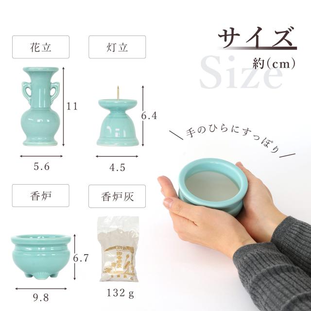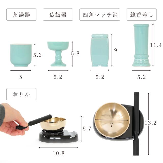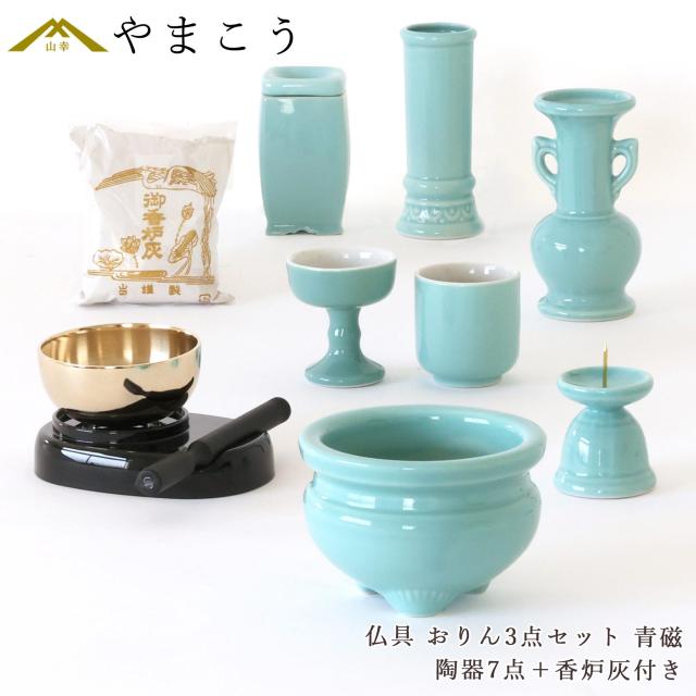 仏具 セット ミニ おりん 3点 + 陶器7点 (青磁 青地 ブルー) + 香炉灰 仏具セット おしゃれ モダン 線香立て マッチ消 国産 日本製 仏壇セット モダン仏具 モダン仏壇 お盆 お彼岸 お墓参り お供え 供養 法事 法要