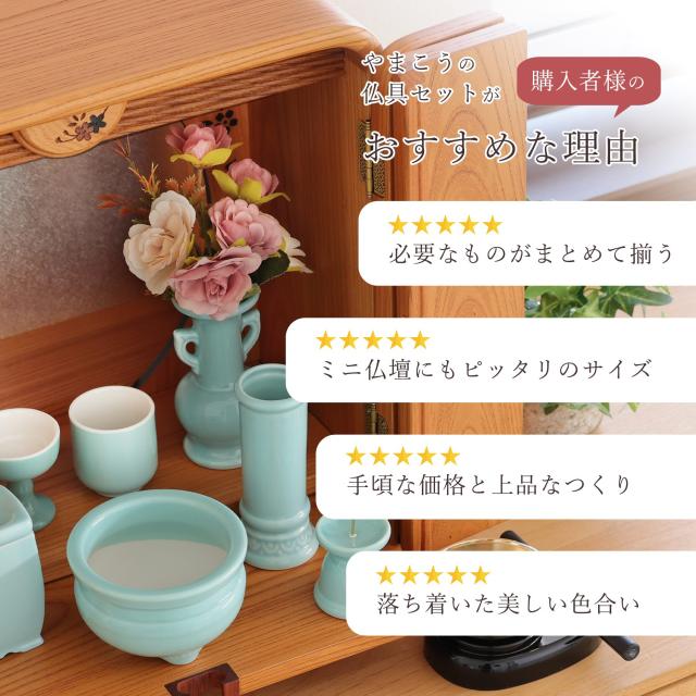 爽やかで落ち着いた色合いの薄ブルーが美しい国産陶器の仏具セット。