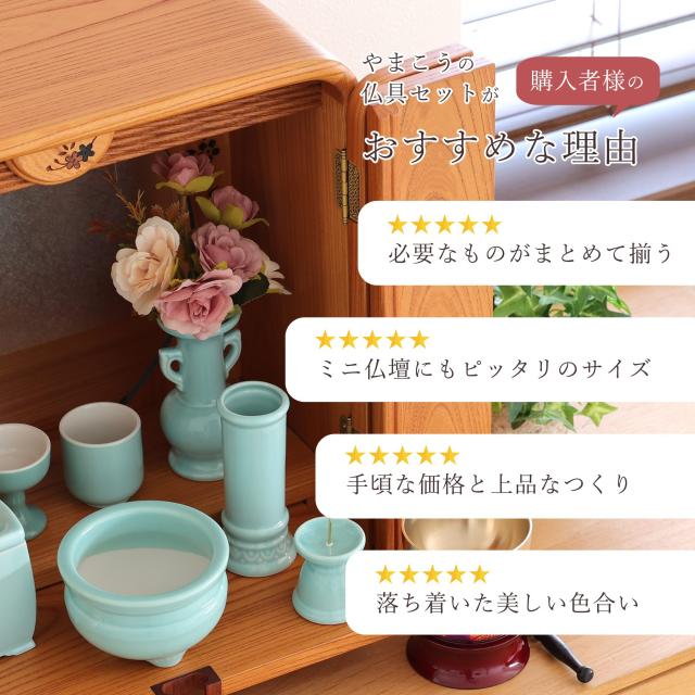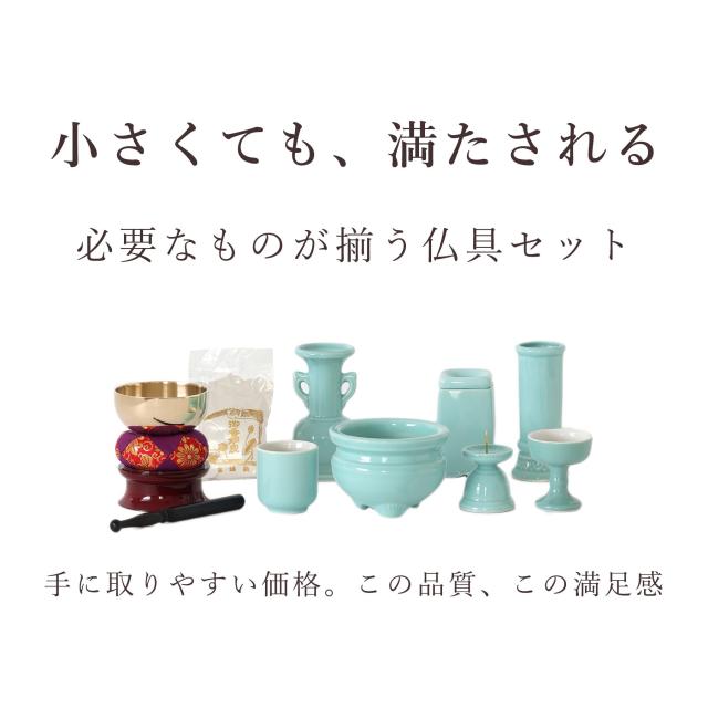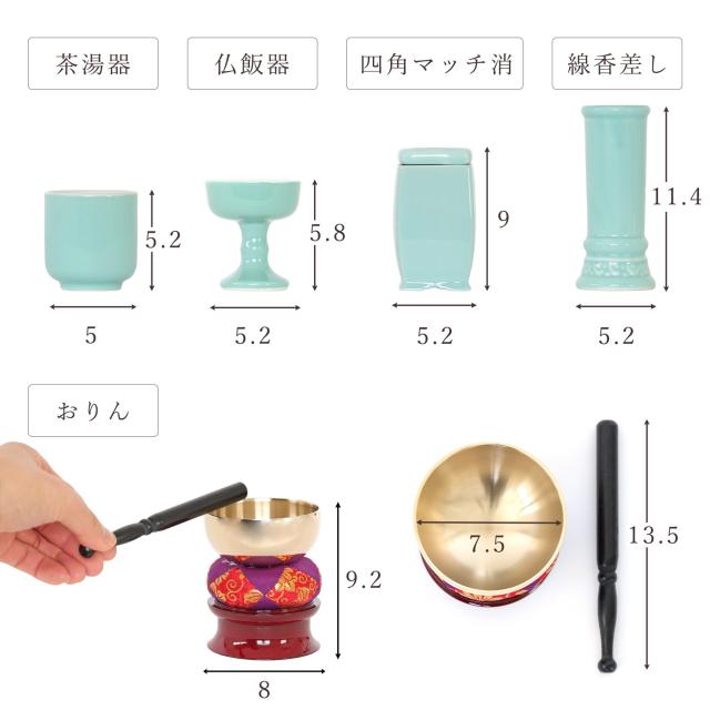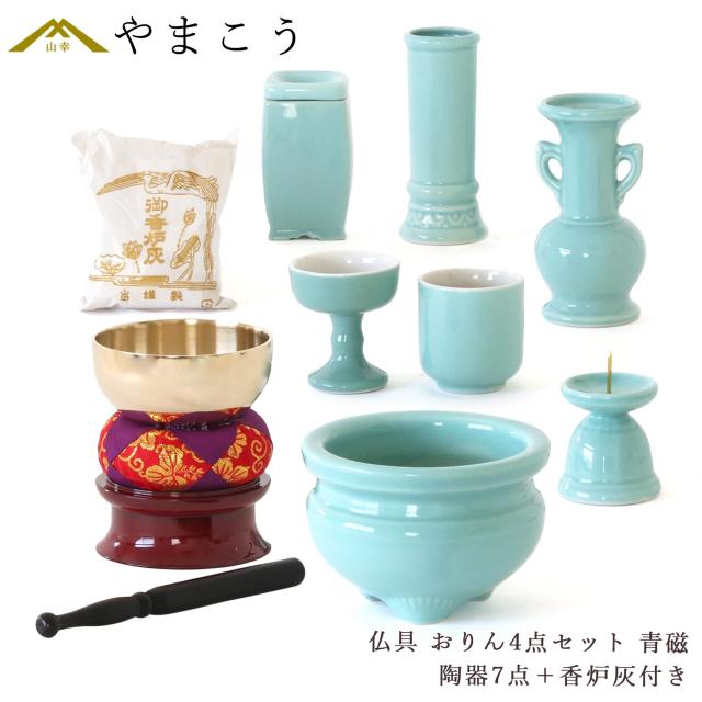 仏具 セット ミニ おりん 4点 + 陶器7点 (青磁 青地 ブルー) + 香炉灰 仏具セット おしゃれ モダン 線香立て マッチ消 国産 日本製 仏壇セット モダン仏具 モダン仏壇 お盆 お彼岸 お墓参り お供え 供養 法事 法要