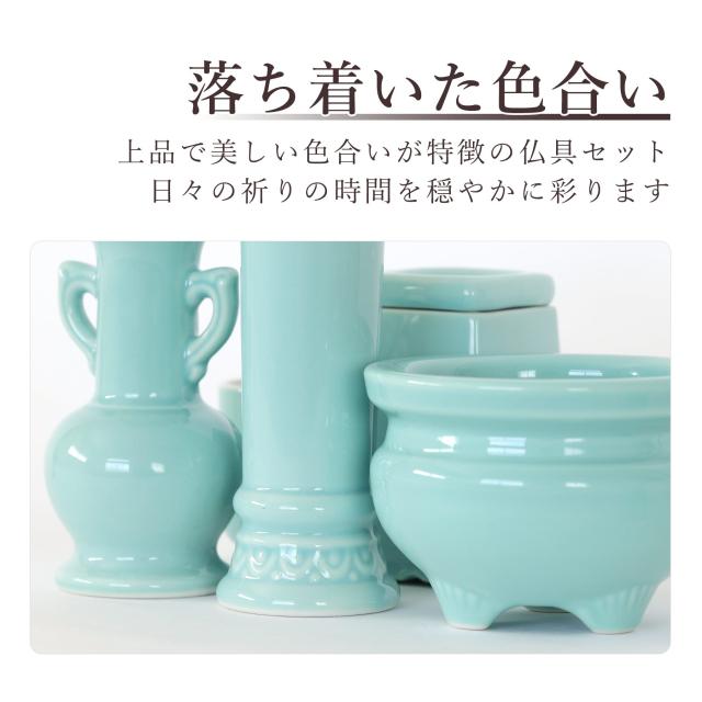 爽やかで落ち着いた色合いの薄ブルーが美しい国産陶器の仏具セット。