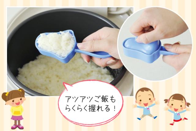 ご飯はハンドル付きの型で握るので、熱いご飯を直接触ってやけどをしてしまう心配がありません。