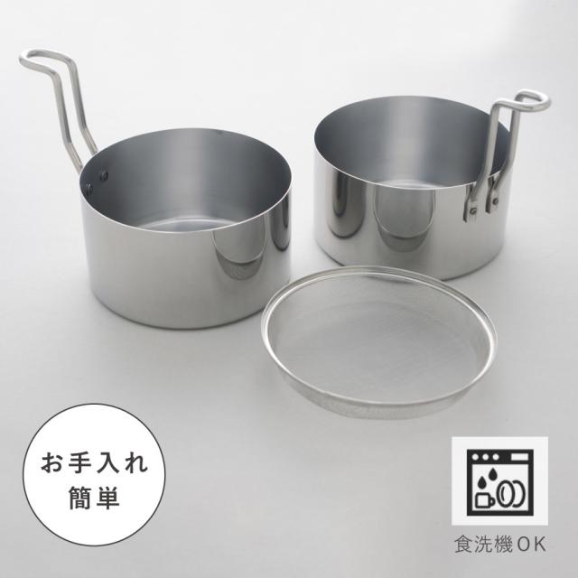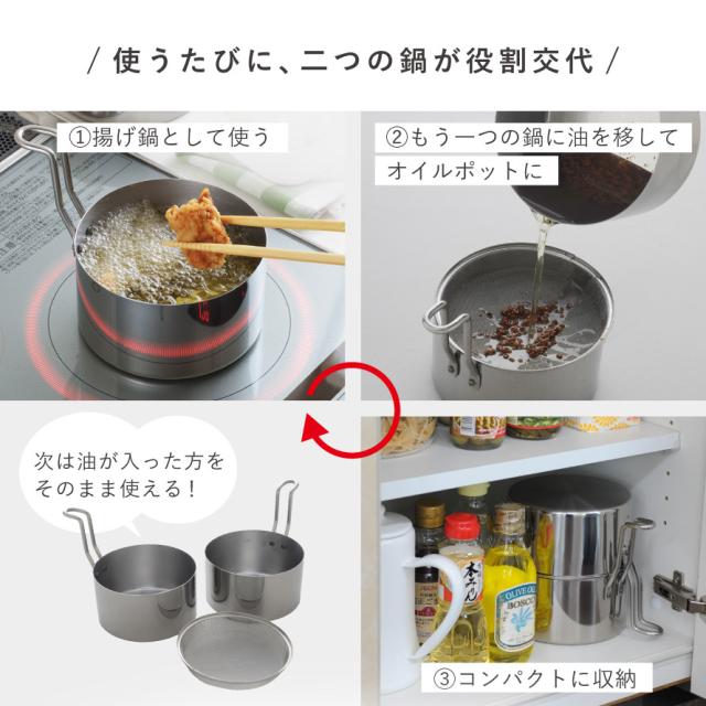 毎日のお弁当作りで揚げ物をする方にうれしい、揚げ鍋とオイルポットがひとつになった2WAY仕様の揚げ鍋セットです。揚げ鍋として使ったあとは、付属の網皿をセットするだけで油をそのままこせるので、面倒な油の移し替え作業が不要。もう一方の鍋を蓋として重ねて保存でき、揚げ物後の後片付けが驚くほどスムーズになります。