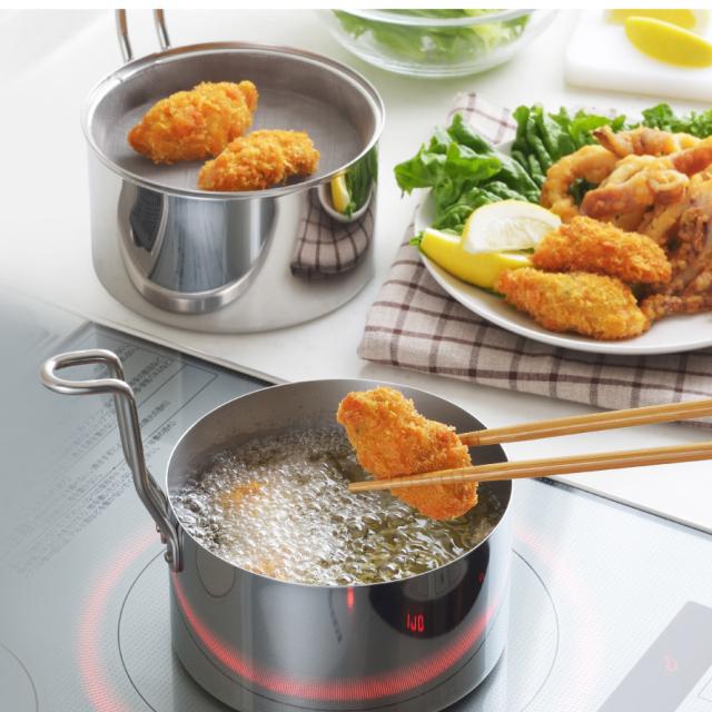 ガス火・IHのどちらにも対応しており、忙しい朝のお弁当作りから普段の食卓まで幅広く活躍。場所を取らず、少量の油で効率よく使える、毎日忙しい主婦の味方になる揚げ鍋セットです。