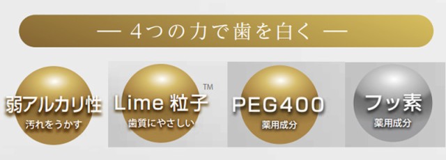 | 成分 | 清掃剤:炭酸カルシウム(Lime粒子) 溶剤:精製水 湿潤剤:濃グリセリン 薬用成分:ポリエチレングリコール(PEG)400、モノフルオロリン酸ナトリウム(フッ素) 甘味剤:キシリトール 粘結剤:ヒドロキシエチルセルロース、 カルボキシメチルセルロースナトリウム 香味剤:香料(ピュアミントタイプ) pH調整剤:リン酸水素二ナトリウム、水酸化ナトリウム 増粘剤:無水ケイ酸 保存剤:パラベン |