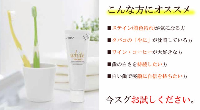 | 商品特長 | ・輝き続ける白い歯に!4つの力で歯を白く! ・ステイン(着色汚れ)が気になる方、タバコのやにが沈着している方、白さを持続したい方、(ホワイトニング後、プロフェッショナルケア後)、輝く白い歯で笑顔に自信を持ちたい方に。 ・弱アルカリ性で汚れを落としやすくし、従来品よりもキメ細かな粒子(清掃剤)を高濃度に配合し歯にやさしいながら落としにくいステインを除去します。 ・薬用成分PGE400がタバコのやにを溶解除去、薬用成分「モノフルオロリン酸ナトリウム」が歯質の再石灰化を促進し虫歯の発生と進行を予防します。 |