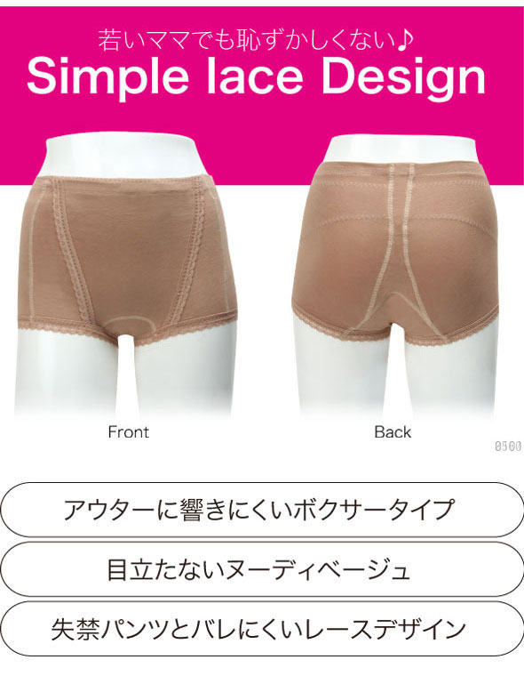 産後も続くチョイ漏れは、ぱかぱか骨盤ゆるみ、ぽっこり下腹ゆるみ、ちょいモレ膀胱ゆるみの3大ゆるみのサイン!?実はこのゆるみ、骨盤の開きと骨盤底筋のゆるみが大きく関係しているんです。骨盤底筋とは?骨盤内で内蔵や膀胱、生殖器を下から支える重要な筋肉群。臓器を下からハンモック状に支える働きをしています。意識して動かしにくく、出産や加齢を機に緩みやすい部分です。骨盤底筋をハンモック状パワーネットで引き上げ+横からの骨盤サポート!産後の漏れにくい体型に戻します。もしもの時も安心の吸水防臭3層パッド付。スキニーパンツを履いてもアウターに響きにくいボクサータイプで若い方でも年配の方でもお使いいただけます。素材/組成/身生地:綿 95%、ポリウレタン5% レース:ナイロン、ポリウレタン カラー/モカベージュ ヒップサイズ/M(87-95cm)、 L(92-100cm)、 LL(97-105cm)