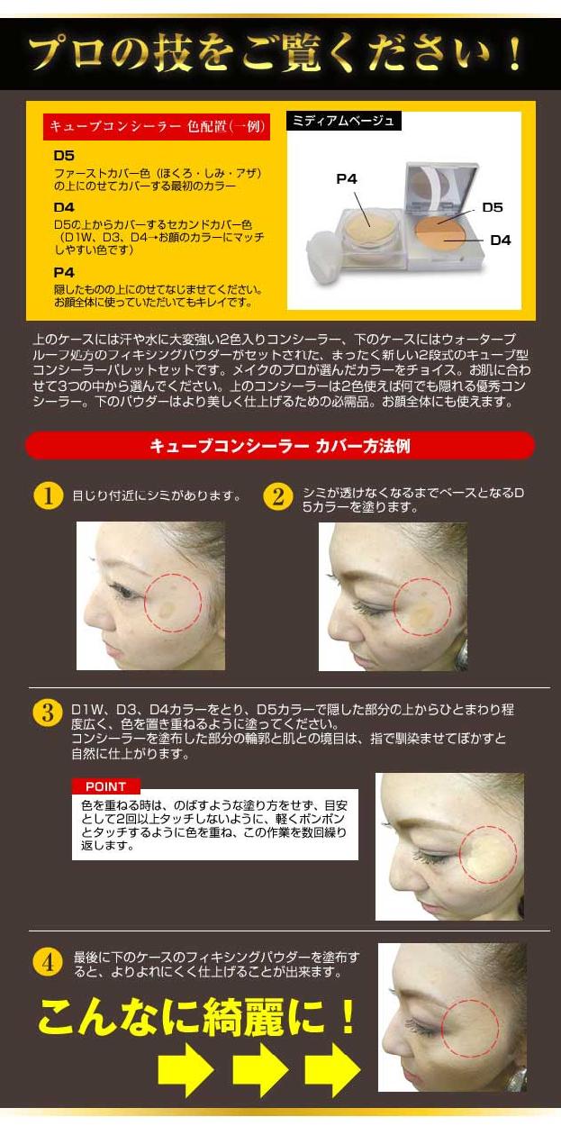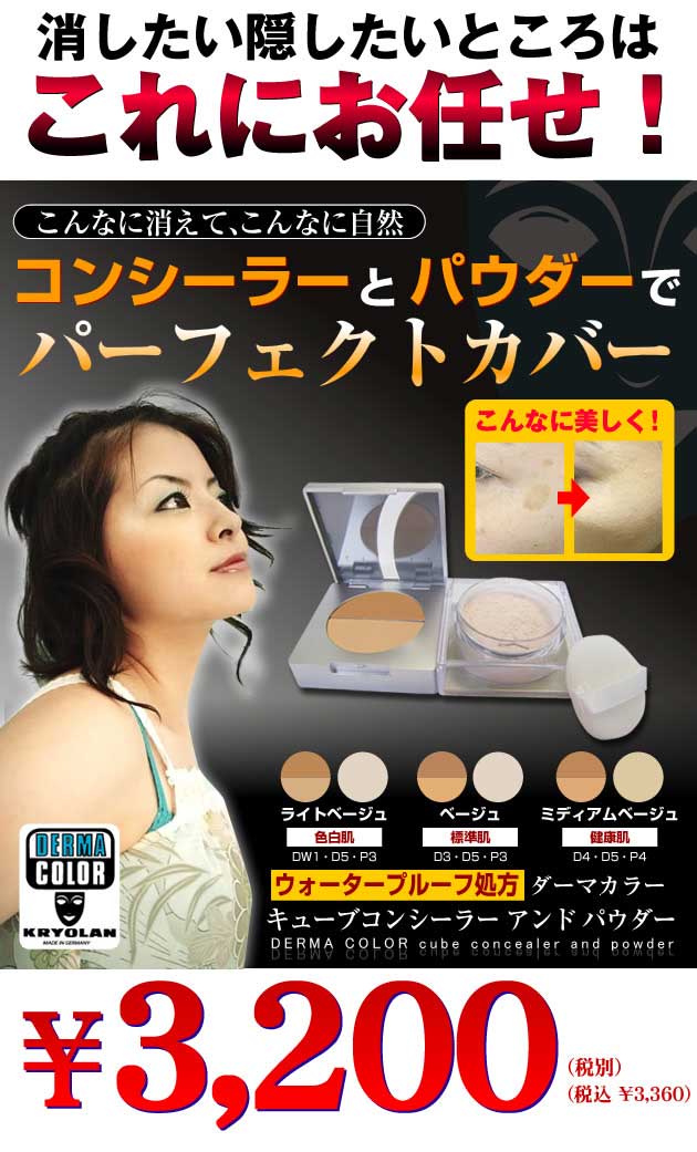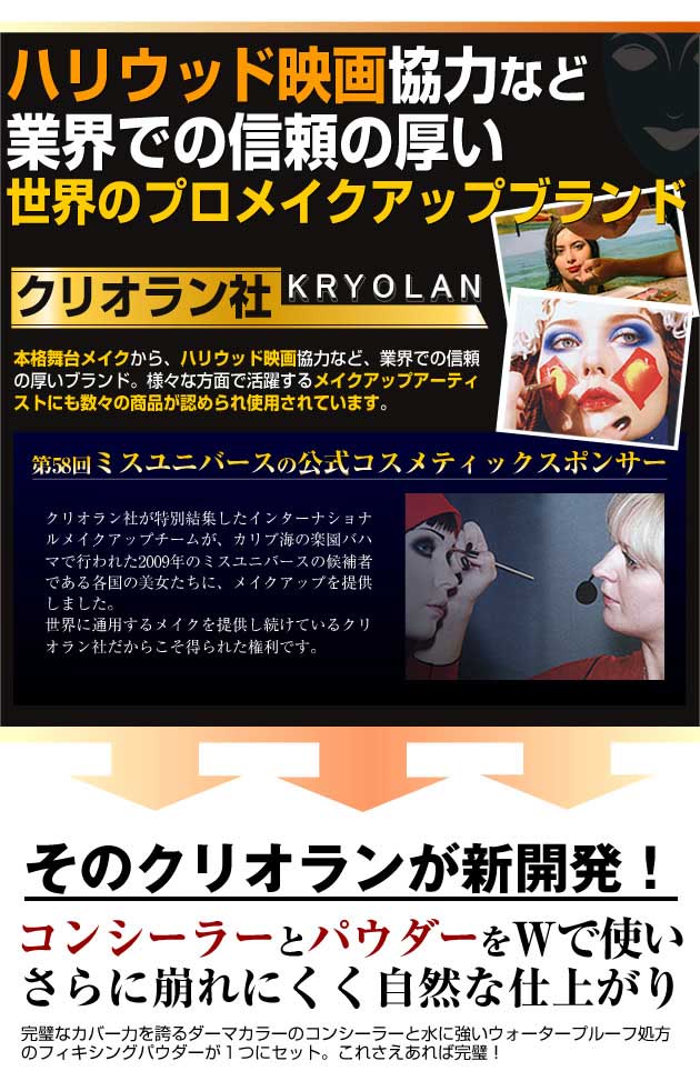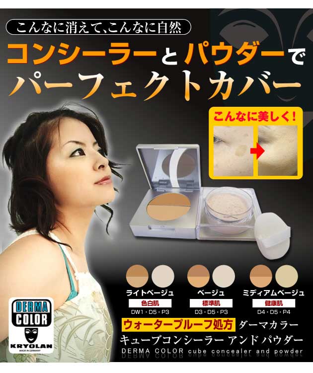 憎き女性の天敵を、パーフェクトカバーしてくれるコンシーラーとウォータープルーフ処方のフィキシングパウダーがセットになって新登場!隠すことだけを考えて作られたコンシーラーだから徹底的にカバーしてくれるんです。強力なカバー力を誇るダーマカラーのコンシーラーと水に強いウォータープルーフ処方のフィキシングパウダーがなんと1つにセットされたとってもかわいいキューブ型♪持ち運びにも便利だからポーチの中にもすっきり♪本格舞台メイクから、ハリウッド映画協力、写真撮影時のメイクアップ(シミ・シワ・キズ・アザ隠し)で業界から絶大な評価を得ている世界のプロメイクアップブランド「クリオラン社」。様々な方面で活躍するメイクアップアーティストにも数々の商品が認められ使用されています。ドイツ生まれの化粧品メーカーで、完璧で完全なカバー力と心地良い使用感で、世界各国で愛用されています!内容量 コンシーラー:3.5g フィキシングパウダー:8g