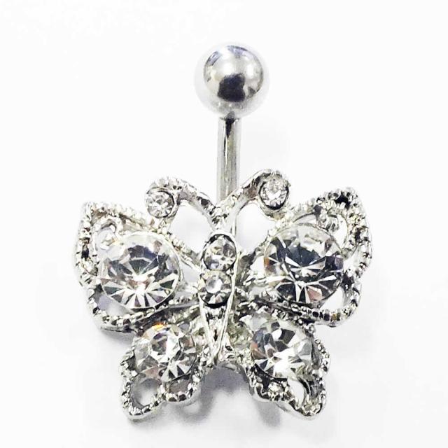 大きなシルエットの蝶々にクリスタルのジルコニアをセットしたキラキラのへそピアス。蝶々をモチーフにしたへそピアスは女性人気が高く、年齢層に関係なく支持されるボディピアスです。プレゼントにもおすすめです。おへそのピアスとしてはもちろん耳に付けても綺麗。