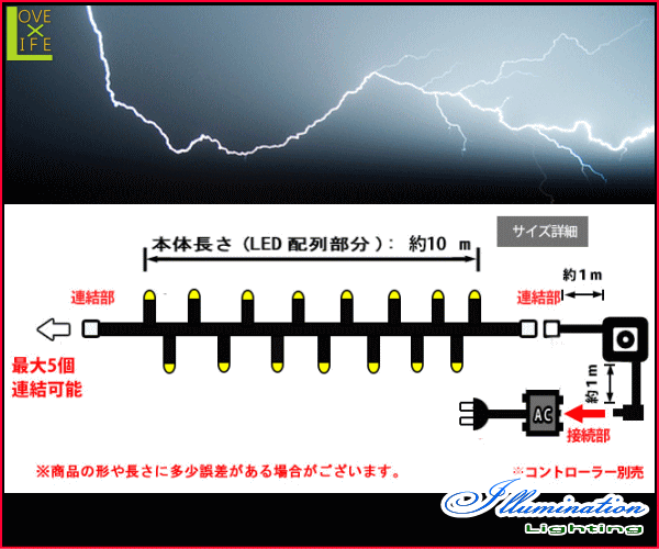 ■特徴■【20 】LEDライジング ストレート【200球】【ライト】【雷】【落雷】【稲妻】空を轟かせる大迫力のライトが新登場♪イナズマのように光る一閃が美しいです!LEDライジングシリーズでかっこよく飾りつけ☆【2013年新作】【】【大人気】【電飾】【イルミネーション】【クリスマス】【モチーフ】【LED】【大人気】【大人気】【ライト】【ガーデン】■仕様■サイズ:全長:約10m発光ダイオード(LED球)コード:クリア・PVC電源コード:ABS樹脂消費電力:45W(家庭用100Vコンセント) 製造年:2013■イルミネーション■は電飾(イルミネーション)商品が豊富です!LED・白熱球と多種多様!クリスマスやイベントなどなど♪お客様のデコレーションにぜひどうぞ♪(^^)/入荷待ち・在庫切れの場合がございますので申し訳ございませんがご了承下さい。