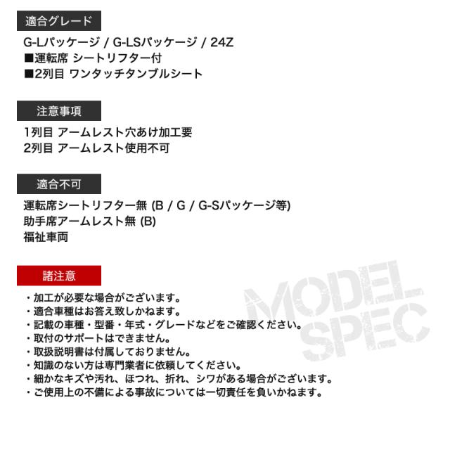 | 適合不可 | 運転席シートリフター無 (B / G / G-Sパッケージ等)助手席アームレスト無 (B) 福祉車両 |