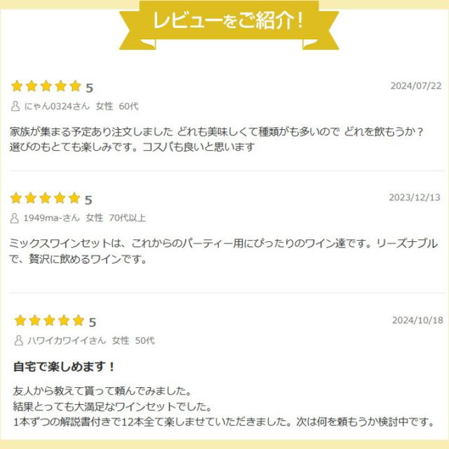 - 前回注文したセットがどれも美味しかったので。今回もすでに2本飲みましたが、やっぱり美味しいです!大満足で、毎日ペアリングをどうしようか考えるのが楽しみです!