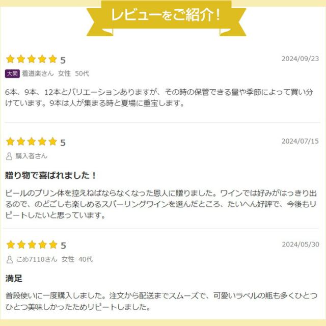 - 家族が集まると、ワインやスパークリングワインを飲むので、どれを飲もうかと選ぶのも楽しいです。また、お手頃の値段で買えて良かったです。
