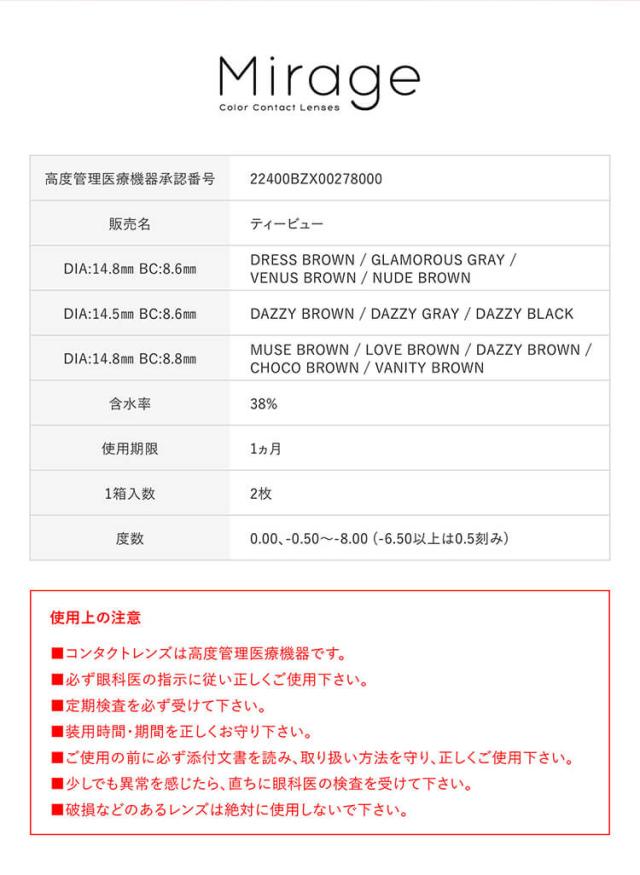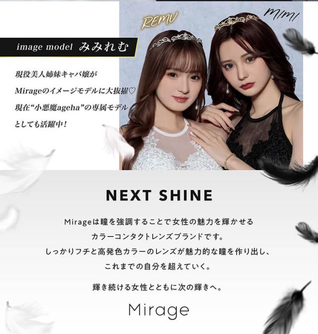 | ●商品ポイント | 現役美人姉妹キャバ嬢が ミラージュのイメージモデルに大抜擢! ミラージュは1箱2枚入りのコスパ最強 マンスリーカラコンです♪ しっかりフチと高発色カラーのレンズが 魅力的な瞳を作り出し、これまでの自分を超えていく。 輝き続ける女性とともに次の輝きへ。 |