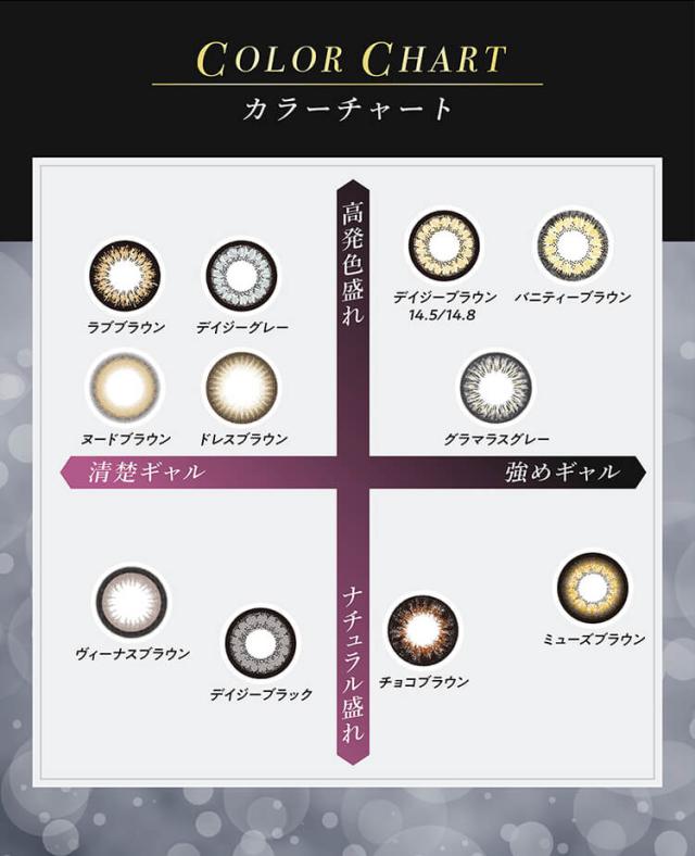■ドレスブラウン(DRESS BROWN) 【DIA14.8mm / GDIA14.0mm / BC8.6mm】 繊細な3トーンブラウンで華やかに盛れる瞳に。 ■グラマラスグレー(GLAMOROUS GRAY) 【DIA14.8mm / GDIA14.0mm / BC8.6mm】 黒フチに高発色グレーでハーフな瞳に。 ■ヴィーナスブラウン(VENUS BROWN) 【DIA14.8mm / GDIA14.0mm / BC8.6mm】 しっかりフチとダークブラウンでうるっと甘い瞳に。 ■ヌードブラウン(NUDE BROWN) 【DIA14.8mm / GDIA13.9mm / BC8.6mm】 今っぽフチと明るめブラウンでちゅるんと盛れた瞳に。 ■デイジーブラウン14.5(DAZZY BROWN 14.5) 【DIA14.5mm / GDIA13.9mm / BC8.6mm】 くっきりフチにブラウンでセルフィー盛れNo.1瞳に。 ■デイジーグレー(DAZZY GRAY) 【DIA14.5mm / GDIA13.9mm / BC8.6mm】 くっきりフチにグレーでクールに決まる瞳に。 ■デイジーブラック(DAZZY BLACK) 【DIA14.5mm / GDIA13.9mm / BC8.6mm】 くっきりフチにブラックで愛されガーリーな瞳に。 ■ミューズブラウン(MUSE BROWN) 【DIA14.8mm / GDIA14.2mm / BC8.8mm】 しっかりフチと高発色ブラウンでラグジュアリーな瞳に。 ■ラブブラウン(LOVE BROWN) 【DIA14.8mm / GDIA14.2mm / BC8.8mm】 ブラックとくすみブラウンの黄金比率で盛り度120%の瞳に。 ■デイジーブラウン 14.8(DAZZY BROWN 14.8) 【DIA14.8mm / GDIA14.2mm / BC8.8mm】 しっかりフチとナチュラルブラウンでリアル盛りNo.1瞳に。 ■チョコブラウン(CHOCO BROWN) 【DIA14.8mm / GDIA14.0mm / BC8.8mm】 ダークブラウンとブラックフチで魅惑のクッキリ瞳に。 ■バニティーブラウン(VANITY BROWN) 【DIA14.8mm / GDIA14.2mm / BC8.8mm】 自目の色味を活かしながら発色するブラウンでセクシーな瞳に。 |
