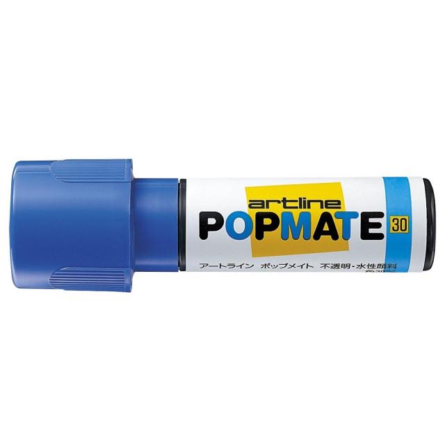 POP描きに適した水性顔料系のマーカー。直径30mmと大きな文字が描きやすく色鮮やかで裏写りもほとんどありません。乾いた後は重ね描きも可能です。インキ色はブルー。