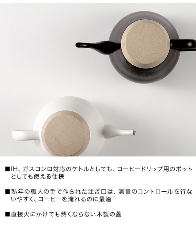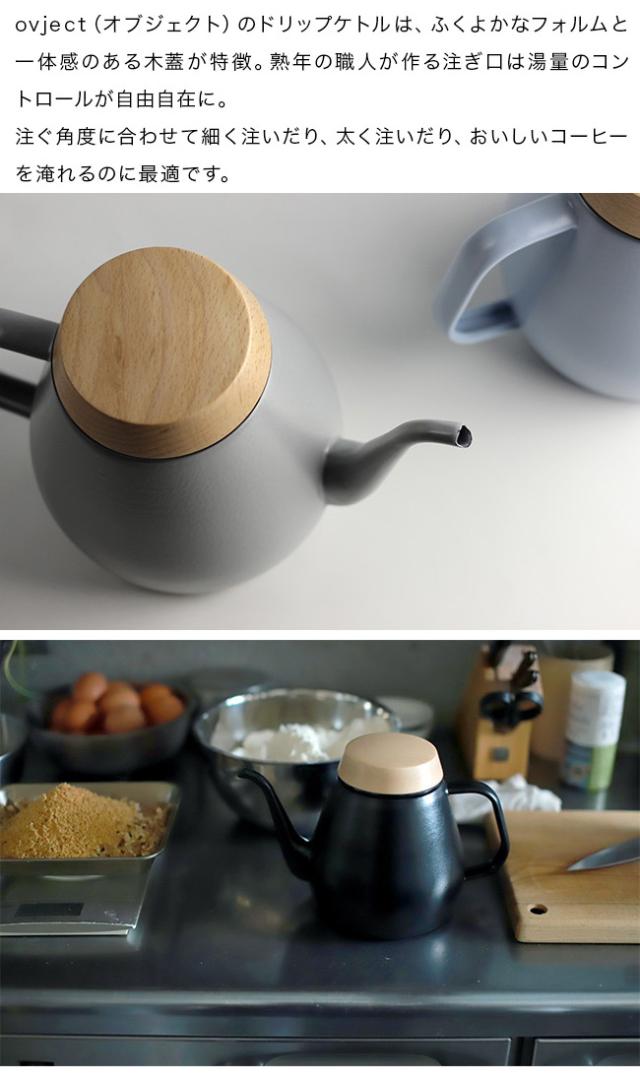 職人の手仕事で作られた優しいカタチのドリップケトル。ovject(オブジェクト)のドリップケトルは丸みのあるフォルムと一体感のある木蓋が特徴。熟年の職人が作る注ぎ口は湯量のコントロールが自由自在に。注ぐ角度に合わせ細く注いだり、太く注いだり、おいしいコーヒーを淹れるのにおすすめです。IH・ガスコンロ対応で、木製の蓋は加熱した際も熱くならず、開閉をスムーズに行えます。蒸気に直接触れる木蓋の底面は、ホーロー銅板でカバーしているので、腐食する心配もありません。おいしいコーヒーを淹れるコーヒードリップ用としても、お湯を沸かすケトルとしてもマルチに使用できるドリップケトルです。