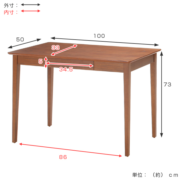 | サイズ | 約 幅100×奥行50×高さ73(cm) 脚間 86(cm) 引出内寸 幅34.5×奥行33×高さ50(cm) |