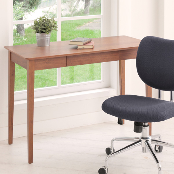天板と脚は天然木にラッカー塗装の仕上げ。美しい木目に控えめな光沢が上品な印象のデスクです。大きめサイズの天板なので、お子様のお勉強やお裁縫、作業など幅広くお使いいただけます。