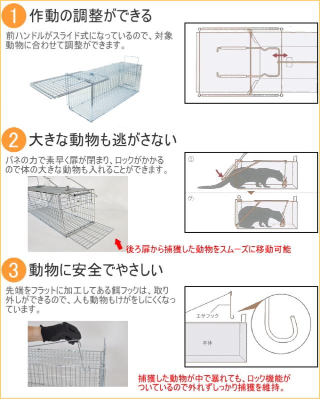| 特徴 | 前ハンドルがスライド式になっているので、対象動物に合わせて調整ができます。 バネの力で素早く扉が閉まり、ロックがかかるので体の大きな動物も入れることができます。 先端をフラットに加工してあるエサフックは、取り外しができるので、人も動物もケガをしにくくなっています。 後扉が開くので、エサの取付けが簡単にできます。 |