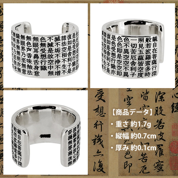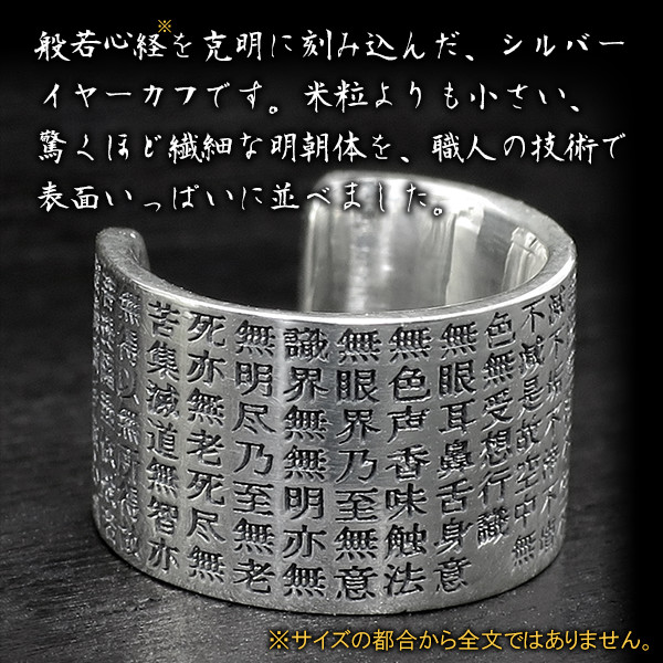 もっとも有名なお経、般若心経を克明に刻み込んだシルバーイヤーカフです。