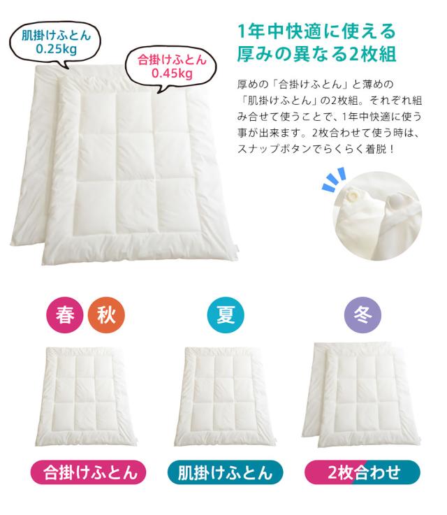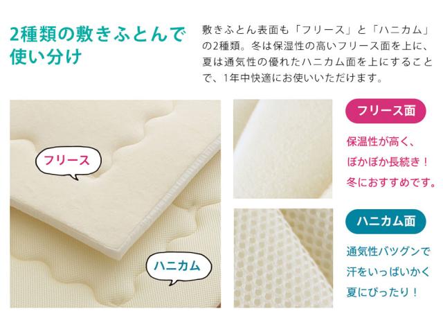 ●ハニカム素材とフリース素材の2種類の敷布団は季節によって使い分けでき、丸洗いも可能。年間通して快適に赤ちゃんの眠りをサポートします。