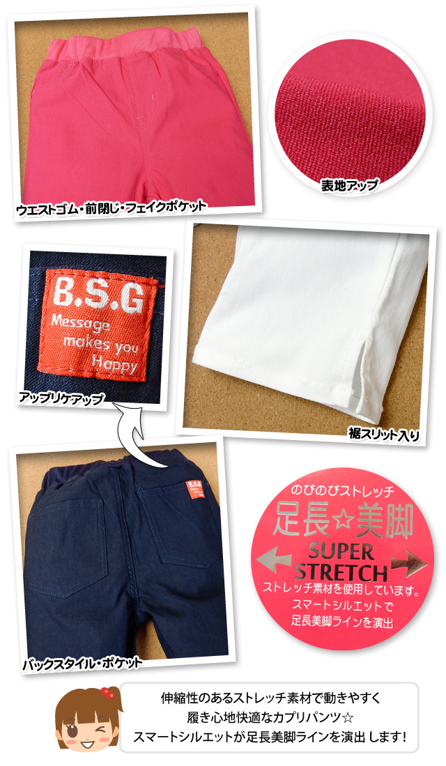 【送料無料】子供服 女の子 カプリ パンツ 裾スリット入り ウエストゴム 前閉じ フェイクポケット スマートシルエット 女児 キッズ 【メール便対応】