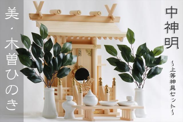 | 伊勢神宮に奉納される「ご神木」は、長野県と岐阜県境をまたぐ木曽山系り産出されます。寒さの厳しいこの地で産出される檜は、目の詰まった美しい年輪をしつらえ、「木曽ひのき」「尾州桧」「官材」等と呼ばれる希少な木材として珍重されます。神棚用の素材として使用される場合は最も高級な製品に使用されています。 その貴重な桧材と優れた木工技術が集約された、美しいお宮、「美・木曽ひのき」シリーズ。上品な木肌と真鍮金具の落ち着いた輝きが高級神棚ならではの趣を演出しています。柾目と板目を使い分けた、職人の技と心意気をも感じる事の出来る工芸品。 大きなお神札を重ねてお祀りできる基本の形、中神明のお社となります。優雅な千木が映える、一社でも存在感のある佇まいです。省スペースで高級な神棚を設置されたい方にお勧め。 神具陶器は特殊加工な金属被膜加工をされた「国産せともの神具セット」。国内唯一の窯元で作成される希少な逸品です。お社の真鍮金具と調和し、大変美しい祭壇となっています。神鏡は金属鏡、台座に細微な彫りを施した「彫り込み神鏡」が付属します。 | |||