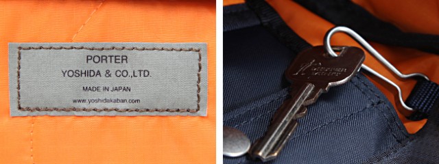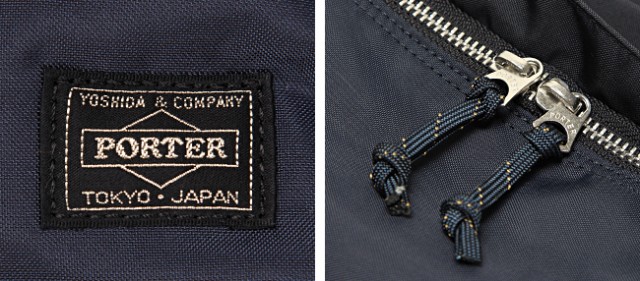 | バッグフェイス部分にはポーターのネームタグが付きます。 | 持ち手のロープと金具部分はバッグのカラーによって色が異なります。 |