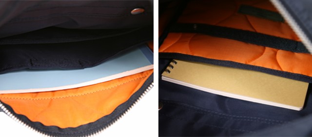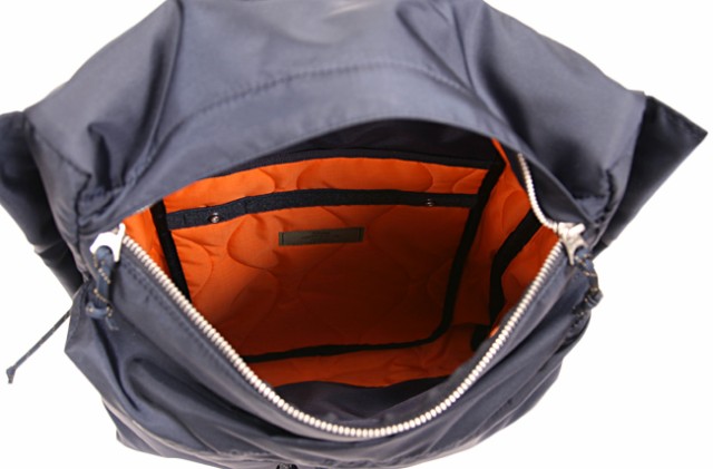 | ミリタリージャケットのライニングをイメージして、内装にはエマージェンシーカラーのオレンジ色で、リップストップナイロンにキルティング加工を施したものを使っています。外観はナイロン素材のバッグですが、持った時に初めてキルティングの軽さ、柔らかさが実感できる素材使いがこだわりです。 |