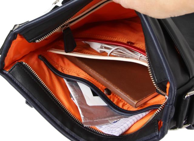 フロント左側にはコの字ファスナーポケットが装備。ペンケースなど縦長アイテムの収納に最適です。