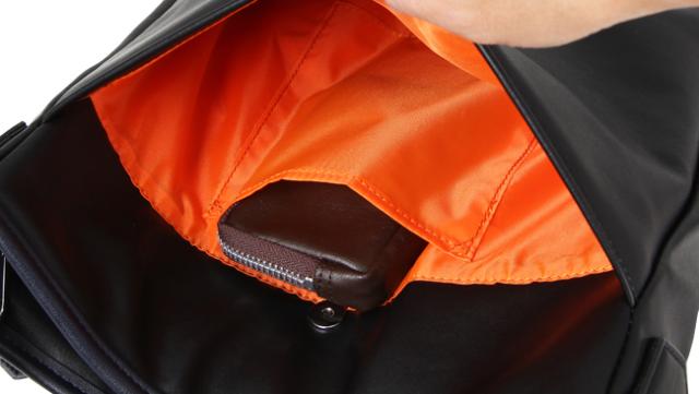 背面には隠しファスナーポケットがあります。内部にはコインケースなど小物アイテムサイズのポケットが装備。