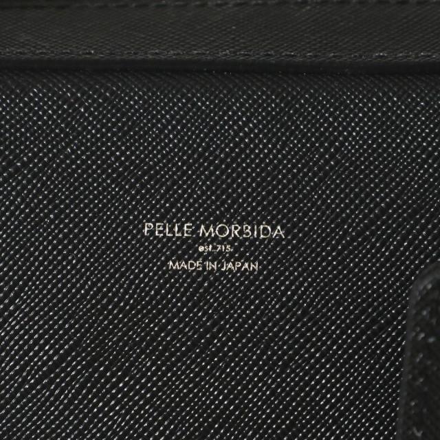 型押ししたレザー(牛革)がシンプルながらも優美な雰囲気に。ファスナーなどいたるところに「PELLE MORBIDA」の刻印がございます。