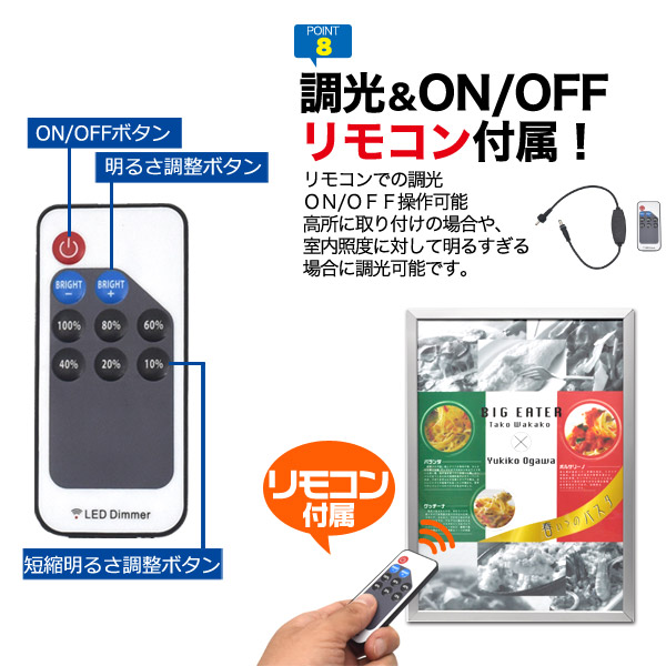 広告やディスプレイにオススメ! LEDライティングボード。 内装、展示会、メニューボード、ウエルカムボード等 幅広い用途で活躍します。 省電力、長寿命のLEDを使用。また、アルミフレームなので、軽量で頑丈です。フィルムの交換は四辺を手で開くスナップ式でワンタッチ!ネジ等を外す手間はございません!壁面直取付の場合にコードが壁に干渉しないよう、段差部分より出ています。