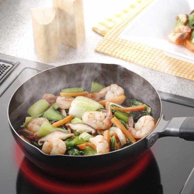 深さがあるので、1人分の野菜炒めや焼きそばなどの調理に最適です。具材がこぼれにくく、油がはねにくいのでコンロまわりが汚れにくくなり、お掃除も楽になります。